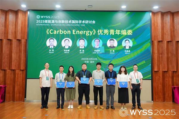 2025年度Carbon Energy优秀青年编委奖于2025 碳能源与创新技术国际学术研讨会上颁发,Wiley出版集团合作总监张大平与Carbon Energy执行编辑金辉乐,为西北大学孙涛、郑州大学尚会姗、温州大学肖遥、山东第一医科大学李晨蔚、郑州大学王鑫、温州大学吕晶晶 6 位青年学者颁奖,以表彰他们在2025年度对期刊的卓越贡献。