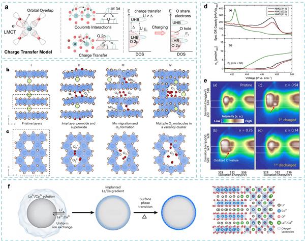 图3:a) 电荷转移模型图显示O 2p电子被拉向Ni 3d,造成O空穴;b-c) 四步O2演化:去锂→O-O二聚→TM离子迁移→O2分子被困于TM空位簇;d) 原位质谱证实高镍NCM811在4.3 V即开始放氧,量达NCM111的2倍;e) 不同SoC下氧氧化可逆窗口:SoC<0.8可逆,>0.8后不可逆氧流失陡增;f) 表面镧化工程形成La/Ca梯度缓冲层,可将晶格氧释放起始电位推迟0.4 V,同时保持Li+快速通道,实现高容量+高稳定双赢。