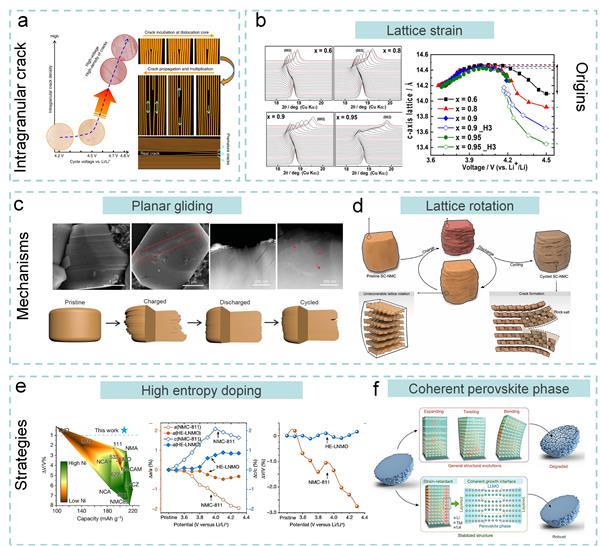 图5:(a)晶内裂纹与循环电压相关,位错辅助裂纹演化过程示意;(b)不同Ni含量(003)面原位XRD及c轴晶格参数变化曲线;(c)循环过程中通过面滑移实现可逆微裂纹演化;(d)反复晶格旋转导致晶内裂纹形成;(e)高熵掺杂策略与(f)钙钛矿相抑制应变积累、缓解晶内裂纹产生。