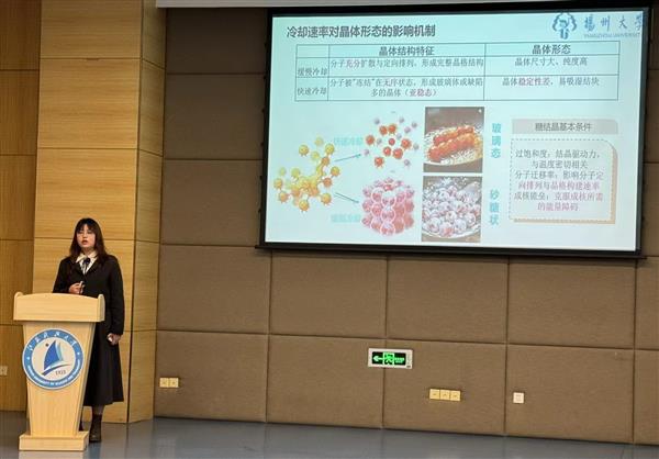 焦加丽同学代表团队做题为“一口酸甜藏定律:热力学视角下冰糖葫芦糖衣的相变奥秘”(焦加丽,巢宇辰)的科普报告