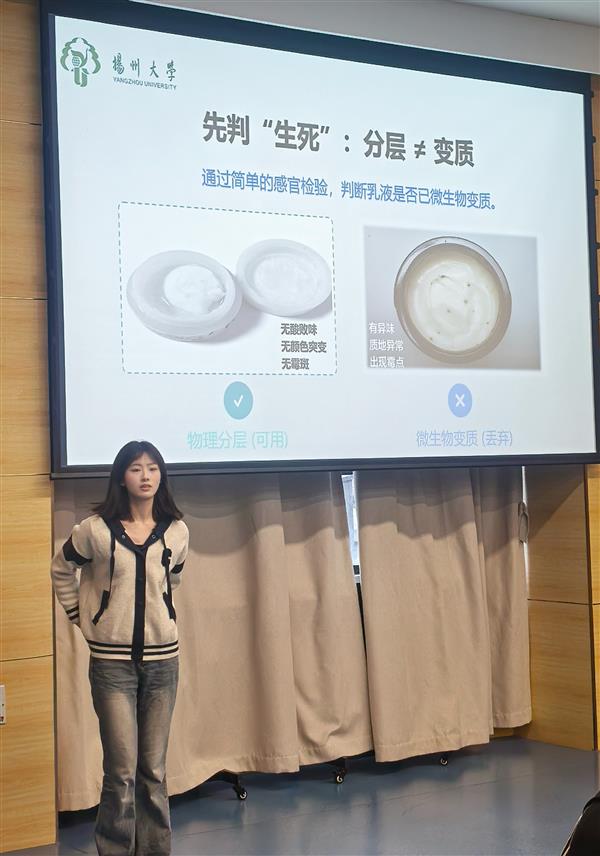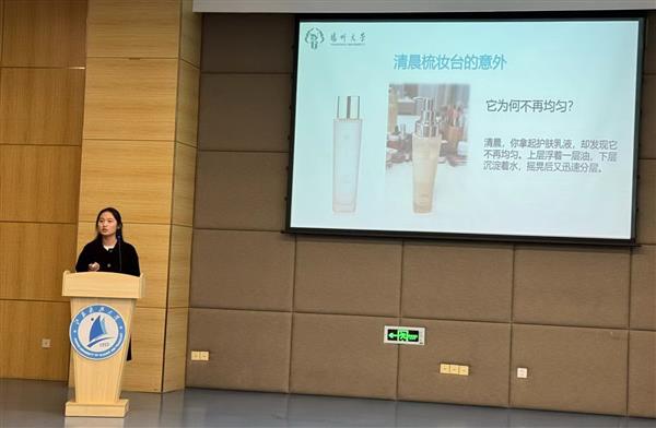 程雨婷同学代表团队做题为“护肤乳液的热力学密码”(程雨婷,刘晓雨,高心睿,张彦森)的科普报告