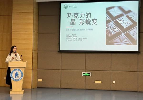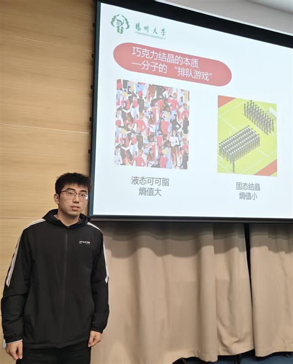 高心睿同学代表团队做题为“巧克力的"晶"彩蜕变”(高心睿,张彦森,程雨婷,刘晓雨)的科普报告