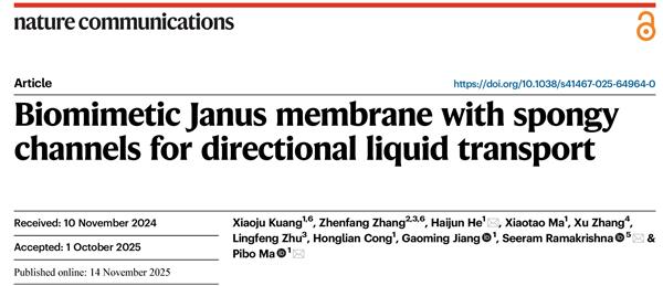 近日,江南大学纺织科学与工程学院/针织技术教育部工程研究中心蒋高明教授团队在综合性国际期刊《Nature Communications》上发表题为“Biomimetic Janus Membrane with Spongy Channels for Directional Liquid Transport”的期刊论文。实现了江南大学纺织科学与工程学院以第一单位在Nature子刊发表论文零的突破。