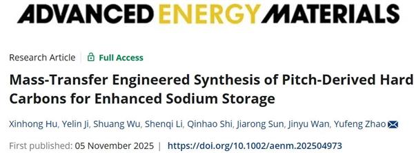 钠离子电池因资源丰富、成本低廉,成为电网储能等领域的热门选择,而沥青基硬碳凭借高性价比,一直是其负极材料的理想之选。但长期以来,可逆容量、初始库伦效率与振实密度三者间的“固有矛盾”,像一道枷锁限制着沥青基硬碳的性能升级。2025年11月5日,上海大学赵玉峰团队在顶刊《Advanced Energy Materials》发表的研究,为这一难题带来了突破性解决方案。团队以Xinhong Hu、Yelin Ji为第一作者,赵玉峰教授为唯一通讯作者,提出“传质增强预氧化”新策略,通过动力学调控氧扩散过程,首次实现了硬碳三大关键参数的同步提升,为钠离子电池负极材料的产业化推进奠定了重要基础。