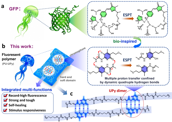 非传统发光聚合物(NTLP)虽在生物相容性、成膜加工性与低成本合成等方面展现出优势,但其在生物及环境检测、智能防伪和柔性电子等实际应用中面临众多挑战。由于缺乏高效的荧光发射中心以及结构柔性导致的固有强非辐射跃迁,使得这类材料的发光量子产率远低于传统共轭体系,更难以在复杂应用中同时实现高效率发光、优良力学性能、损伤自修复及智能环境响应等多功能集成。因此,突破NTLP体系中发光效率与多功能协同的局限,以及阐明其分子水平发光机制,已成为该领域发展中亟待解决的关键问题。本文提出了一种利用精确调控多重氢键组装结构构筑功能集成发光超分子聚合物的新策略。该工作受自然界中水母荧光蛋白(GFP)发光机制及其多功能集成特性的启发,通过调控聚氨酯超分子聚合物中脲基嘧啶酮(UPy)二聚体中四重氢键组装结构和链间聚集态结构,实现了多重氢键限域的高效激发态质子转移(ESPT)过程,在NTLP中实现了高达52%的量子产率。这种动态可切换的四重氢键组装结构突破了传统单一氢键结构的本征特性,不仅充当了高效率发色团,还赋予聚合物材料强韧性、自修复性能、刺激响应性和可再加工性等多种功能的高度集成。该研究发现并证实了UPy中四重氢键超越单一化学键物理和化学性质的新特性,为通过重构多重化学键开发多功能集成高分子材料提供了新思路。