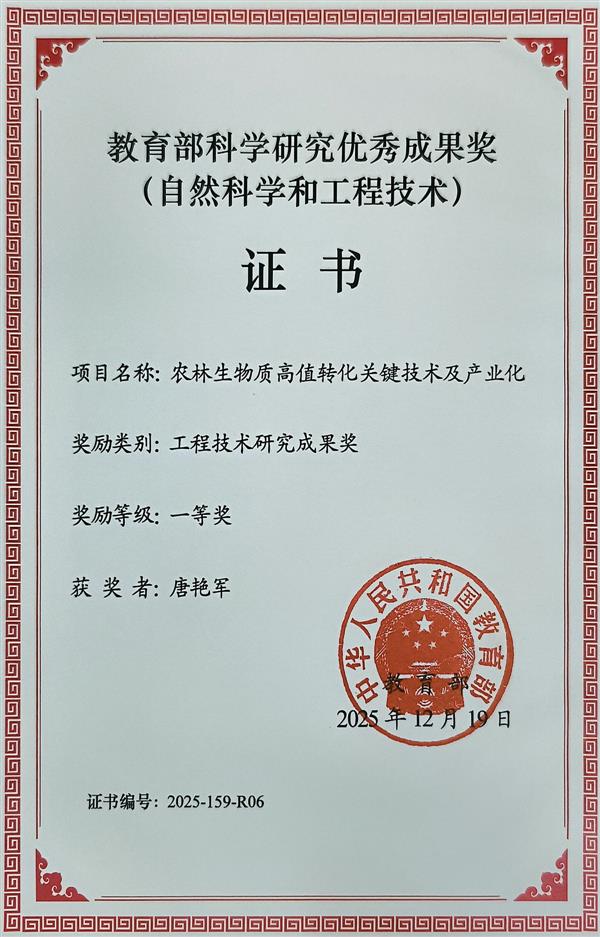 近日,根据教育部发布通知,浙江理工大学作为第二完成单位、唐艳军教授作为主要完成人的科技成果“农林生物质高值转化关键技术及产业化”获2025年教育部科学研究优秀成果奖一等奖。